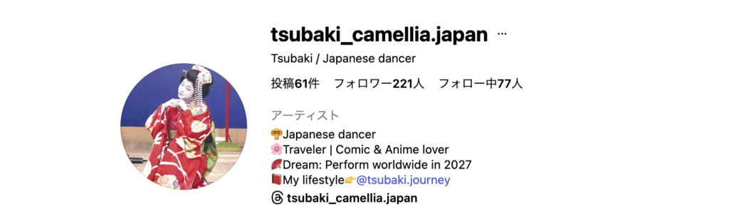 SNS コピー 2025.11.04 目次 InstagramTikTok Instagram ■Instagram: 旅アカウント→Tsubaki.journey 日本舞踊・文化アカウント→tsubaki_camellia.japan TikTok ■TikTok:Tsubaki’s journey @tsubaki.journey